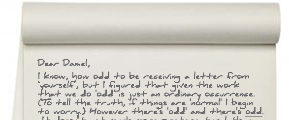 Whatever this letter said, the Daniel of the other reality hadn’t wanted anyone else to be able to read it. He quickly deciphered the text, not paying attention to the individual words or sentences or the meaning therein. He simply copied the letter over, then settled back, white legal pad in hand. That the handwriting in the original was exactly like his own poked at him for only a moment.