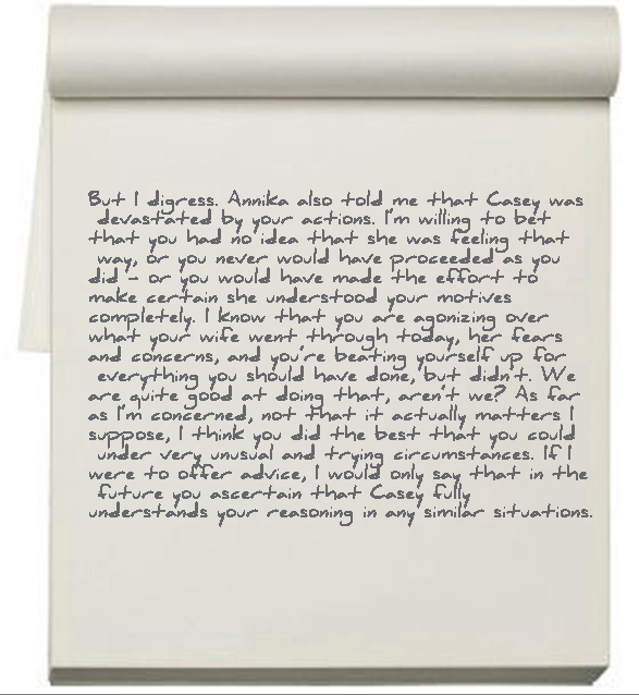 If Annika and her Daniel were anything like she and Daniel, the redhead had shared everything she'd seen and heard that day. Probably even that little...visit...that an apparition of Annika had paid to Daniel. And, being Daniel, he...that is, the ‘other’ Daniel...would be inclined to offer comfort; even if it was to ‘himself’. A bit of understanding. Who else would know exactly what her husband had been thinking and feeling? Casey smiled. "He was able to offer a bit of solace, wasn’t he?"